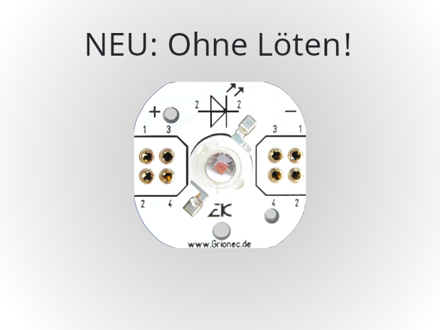 Endlich brauchen Sie nicht mehr zu löten, sondern können die LED einfach mit den passenden Grionec-Elementen zusammenstecken. Danach kleben Sie die LEDs einfach mit einem Wärmeleitklebepad auf einen passenden Kühlkörper. Dank dem neuen wiederverwertbaren System von der Firma Grionec können Sie die LED bei Bedarf einfach wieder entfernen und anderweitig verwenden oder austauschen. Ganz wie es beliebt.